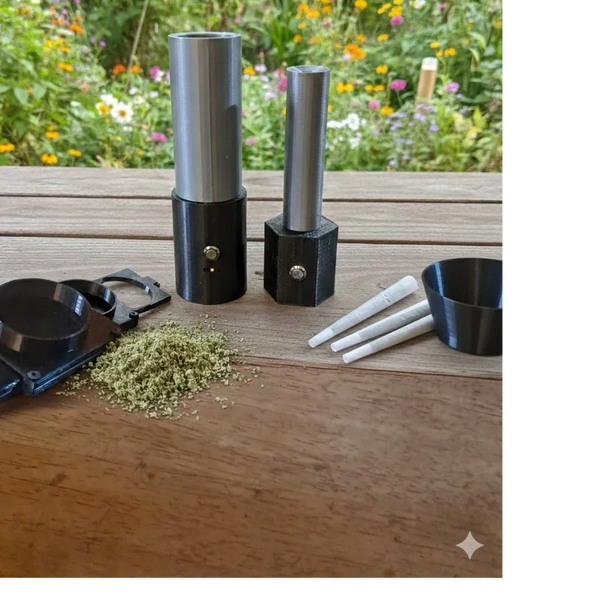 The Big Buddy cone-filling device pairs with a grinder on top, allowing seamless grinding and direct cone filling in one step.